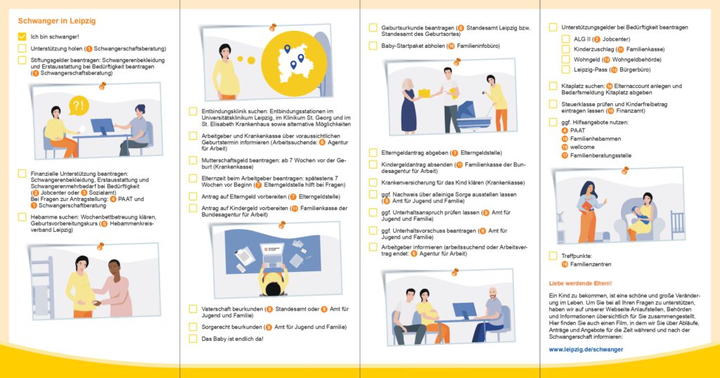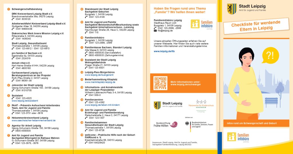 Wenn Sie schwanger sind, können Sie viele Information von einer Schwangeren-Beratungsstelle bekommen. Die gibt es bei der AWO, كاريتاس, Diakonie, Donum Vitae, DRK و Pro Familia. Es gibt dazu eine Online-Beratung für Schwangere bei der كاريتاس و Diakonie. Auf diesem Flyer sind diese Beratungsstellen aufgelistet und es gibt eine Checkliste, was alles vor und nach der Geburt wichtig ist: